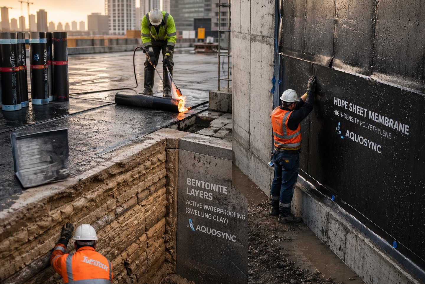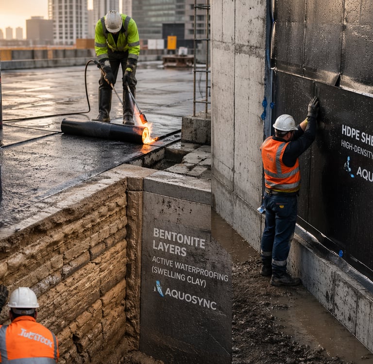 Not all waterproofing systems are built the same, and choosing the wrong type of tanking can quietly turn into one of the most expensive mistakes on a project. Each system is designed for a specific environment, and understanding the difference is what separates a safe job from a future failure. Torch-on membranes are one of the most commonly used systems, ideal for roofs and exposed areas because they create a strong, bonded layer - but they rely heavily on proper installation and surface preparation. Bentonite systems work very differently; they expand when in contact with water, making them perfect for below-ground structures like basements where constant moisture pressure exists, almost like a self-sealing clay barrier. Then you have HDPE and sheet membrane systems, which act as a physical barrier preventing water ingress, often used in critical areas like tunnels, retaining walls, and blindside applications where access is limited after construction. The key is not just knowing these systems, but matching them correctly to the project conditions - exposure, water pressure, substrate, and long-term durability requirements. Choosing a system without understanding this is like wearing the wrong gear for the job - you might get through the day, but it won’t hold up over time. The right tanking decision upfront protects structure, reputation, and long-term cost.